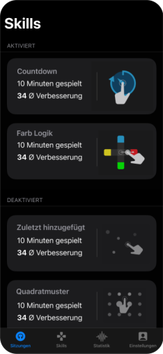 Stress regulation games can be used at any time to e.g. distract from high stress and to regulate emotions during exposure within the therapist-guided exposure. All skills are designed to engage different senses without being addictive.